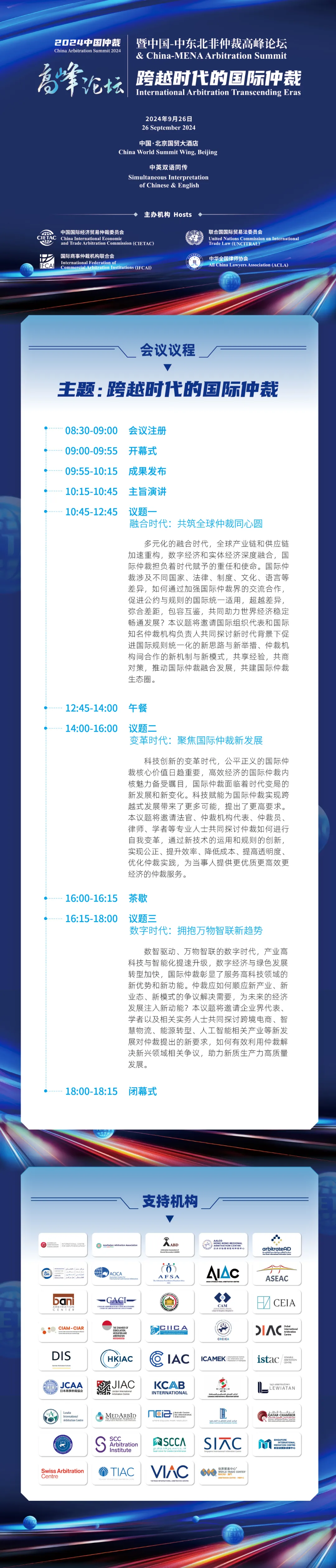 由中国国际经济贸易仲裁委员会(CIETAC),联合国国际贸易法委员会(UNCITRAL) BET体育365投注官网,国际商事仲裁机构联合会(IFCAI)以及中华全国律师协会(ACLA)联合举办的2024中国仲裁高峰论坛暨中国-中东北非仲裁高峰论坛将于2024年9月26日在北京国贸大酒店举办。