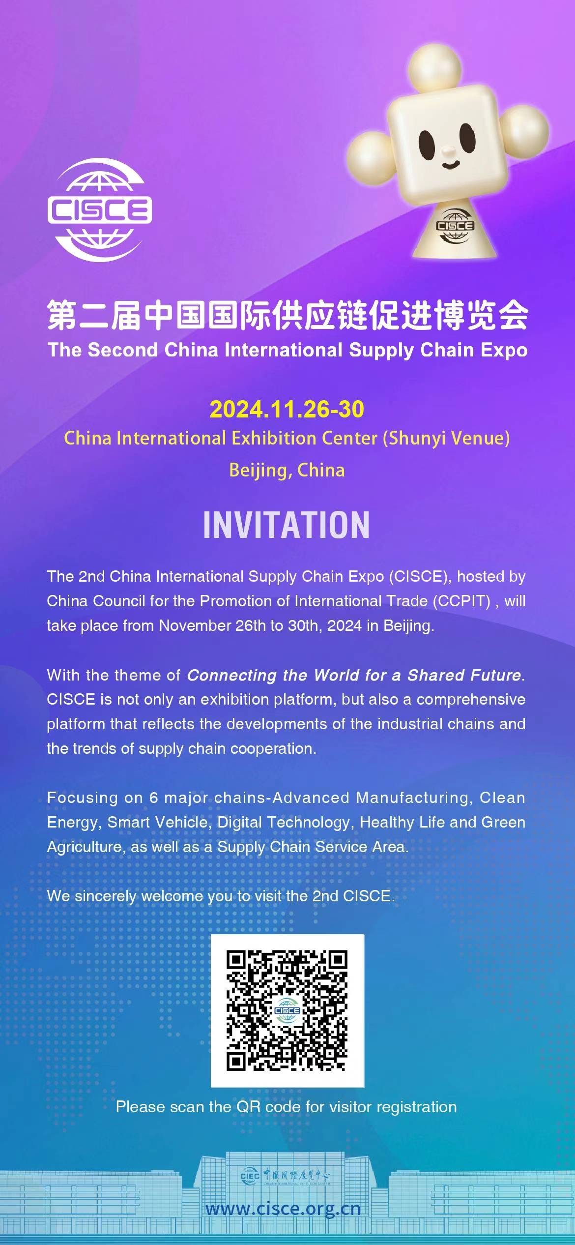 The 2nd China International Supply Chain Expo (ClSCE), hosted byChina Council for the Promotion of International Trade (CCPlT) , willtake place from November 26th to 30th, 2024 in Beijing.